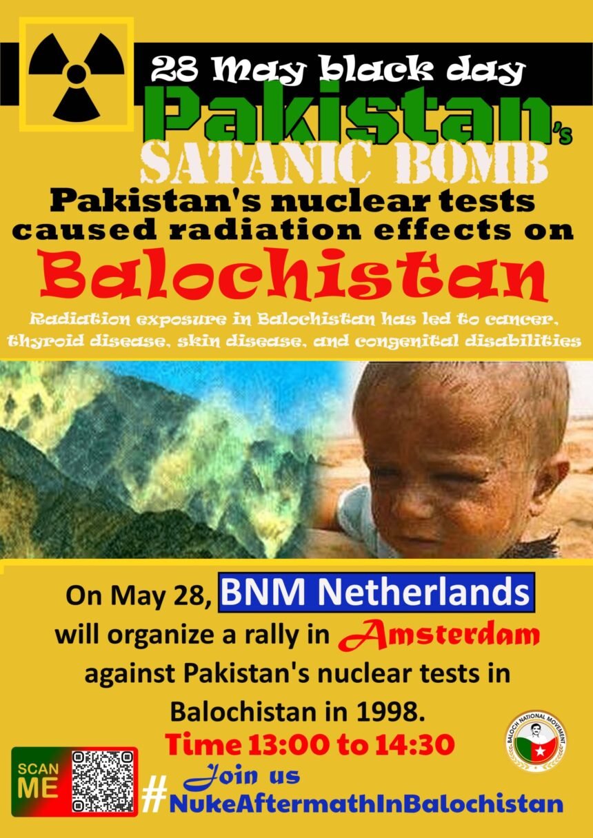 On May 28, BNM Netherlands will organize a rally in Amsterdam against Pakistan’s nuclear tests in Balochistan in 1998.