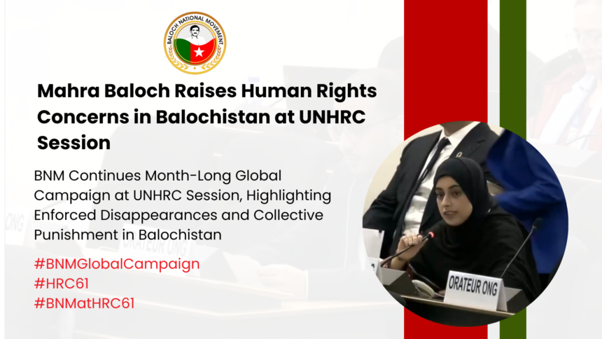 Geneva: Mahra Baloch – @MahraJaleel, a member of the Baloch National Movement (BNM), highlighted the grave human rights situation in Balochistan during the 61st session of the United Nations Human Rights Council.