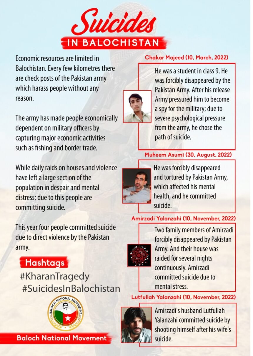 Two family members of Amirzadi forcibly disappeared by Pakistan Army. And their house was raided for several nights continuously. Amirzadi committed suicide due to mental stress.