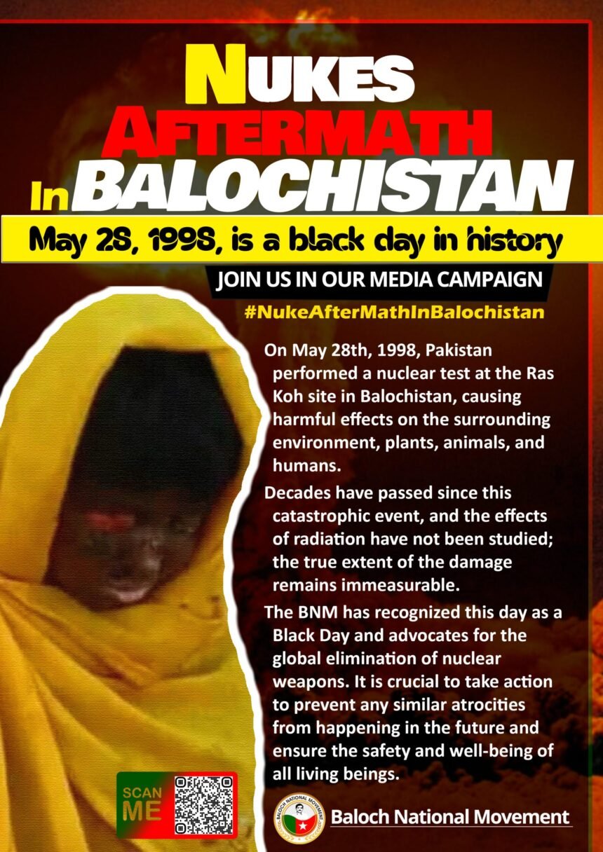 On May 28th, 1998, Pakistan performed a nuclear test at the Ras Koh site in Balochistan, causing harmful effects on the surrounding environment, plants, animals, and humans.