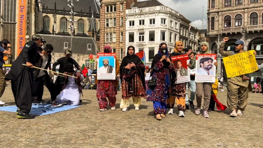 The Baloch National Movement (BNM) held a protest rally at Amsterdam’s Dam Square in the Netherlands to mark the International Day of Enforced Disappearances. A significant number of BNM members participated, carrying placards and photos of victims of enforced disappearances in Balochistan, and chanting slogans against human rights violations.