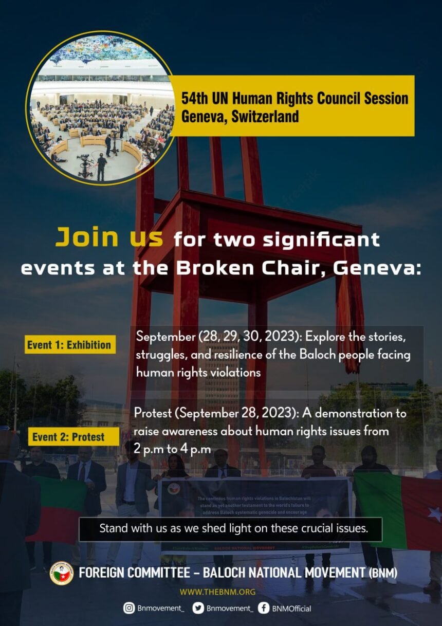 On September 28, the BNM scheduled a two-hour (2 PM to 4 PM) protest demonstration to condemn the human rights violations in Balochistan. This demonstration will be held outside the UNHRC session venue in Geneva (at the Broken Chair). The BNM intends to gather supporters, activists, and concerned individuals to voice their solidarity with the Baloch people and demand immediate action from the international community. The protest aims to draw attention to the plight of the Baloch people and put pressure on relevant authorities to address the ongoing violations.